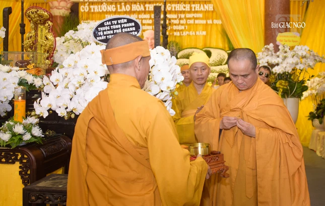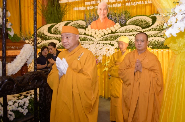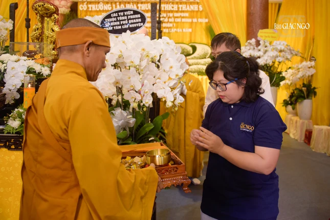 Trước Giác linh đường Trưởng lão Hòa thượng tân viên tịch, Thượng tọa Thích Tâm Hải, cùng thành viên đoàn Báo Giác Ngộ thành kính dâng hương tưởng niệm, đảnh lễ Giác linh, hữu nhiễu kim quan và ghi sổ tang tưởng niệm công đức vị Trưởng lão Hòa thượng đã có nhiều đóng góp cho Giáo hội, Phật giáo TP.HCM và Q.1.