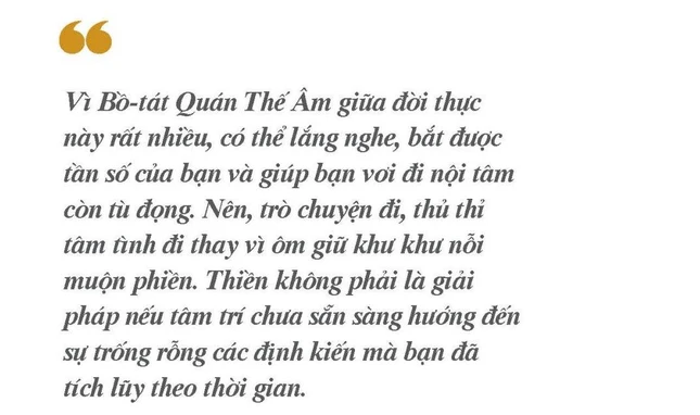 Vì Bồ-tát Quán Thế Âm giữa đời thực này rất nhiều, có thể lắng nghe, bắt được tần số của bạn và giúp bạn vơi đi nội tâm còn tù đọng. Nên, trò chuyện đi, thủ thỉ tâm tình đi thay vì ôm giữ khư khư nỗi muộn phiền. Thiền không phải là giải pháp nếu tâm trí chưa sẵn sàng hướng đến sự trống rỗng các định kiến mà bạn đã tích lũy theo thời gian.