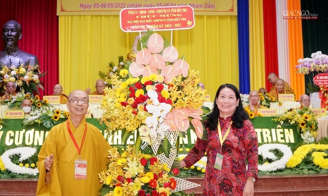 Đại diện Tỉnh ủy, bà Hồ Thị Hoàng Yến phát biểu ghi nhận và trân trọng đánh giá cao những đóng góp của Phật giáo tỉnh trong nhiệm kỳ qua, đặc biệt là các chương trình từ thiện, xây dựng cầu đường, phòng chống Covid -19, an sinh xã hội... Với những thuận lợi mới, bà Phó Bí thư Thường trực Tỉnh ủy kỳ vọng, tin tưởng thời gian tới tân Ban Trị sự GHPGVN tỉnh sẽ tiếp tục đồng hành cùng Đảng, chính quyền các cấp tiếp tục phát huy tinh thần “hộ quốc an dân”, nphụng sự xã hội, làm đẹp giàu quê hương Đồng Khởi.