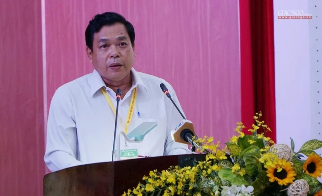 Đại biểu trình bày tham luận "Phật giáo tỉnh Bến Tre hình thành và phát triển", do Sư cô Thích nữ Như Nguyệt, Phó Văn phòng Ban Trị sự trình bày.