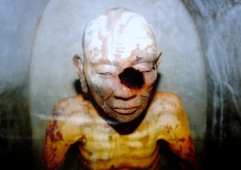 Gỡ mấy viên gạch ra, ông này nhìn thấy một pho tượng giống hệt một người còm nhom đang ngồi trong tháp. Do tò mò, ông ta đã kiếm một cây gậy chọc thử vào pho tượng. Kết quả, ông ta chọc thủng mặt vị thiền sư đã an tọa gần 300 năm trong tháp gạch rêu phong.