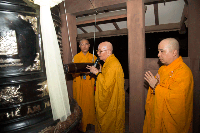 Chư tôn đức tác lễ khai đại hồng chuông tại tháp chuông, trước hương án, tôn ảnh Hòa thượng Tổ sư làm lễ tưởng niệm.