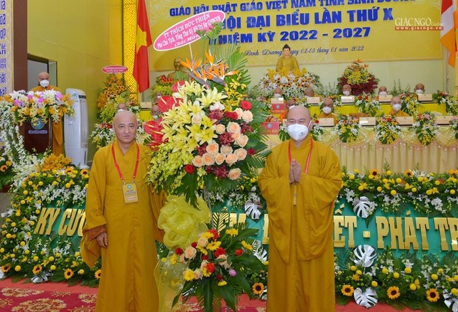 Đại hội đón nhận lẵng hoa chúc mừng của Đức Trưởng lão Hòa thượng Thích Trí Quảng, Quyền Pháp chủ GHPGVN; ông Nguyễn Minh Triết, nguyên Chủ tịch nước gởi đến đại hội chúc mừng, cùng lẵng hoa chúc mừng của Hội đồng Trị sự, lãnh đạo tỉnh Bình Dương được trao tặng tại đại hội.