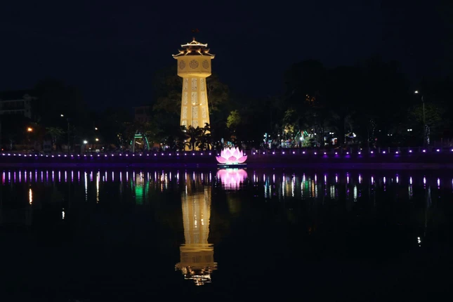 GNO - Kính mừng Đại lễ Phật đản Phật lịch 2567, tối ngày 16-5 (27-3-Quý Mão), tại khu vực tháp nước tỉnh Bình Thuận (đường Bà Triệu), Ban Trị sự GHPGVN tỉnh, Ban Tổ chức Đại lễ Phật đản và Tiểu ban Thiết trí xe hoa - lễ đài đã hạ thủy thử nghiệm đóa hoa sen hồng.
