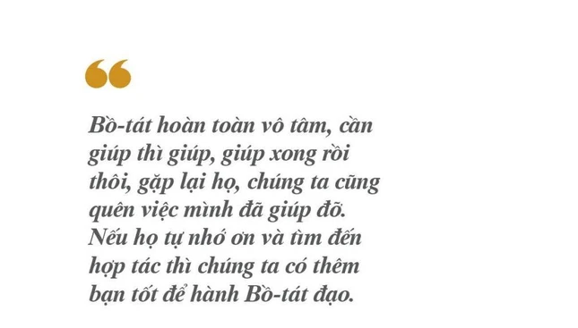 Bồ-tát hoàn toàn vô tâm, cần giúp thì giúp, giúp xong rồi thôi, gặp lại họ, chúng ta cũng quên việc mình đã giúp đỡ. Nếu họ tự nhớ ơn và tìm đến hợp tác thì chúng ta có thêm bạn tốt để hành Bồ-tát đạo.