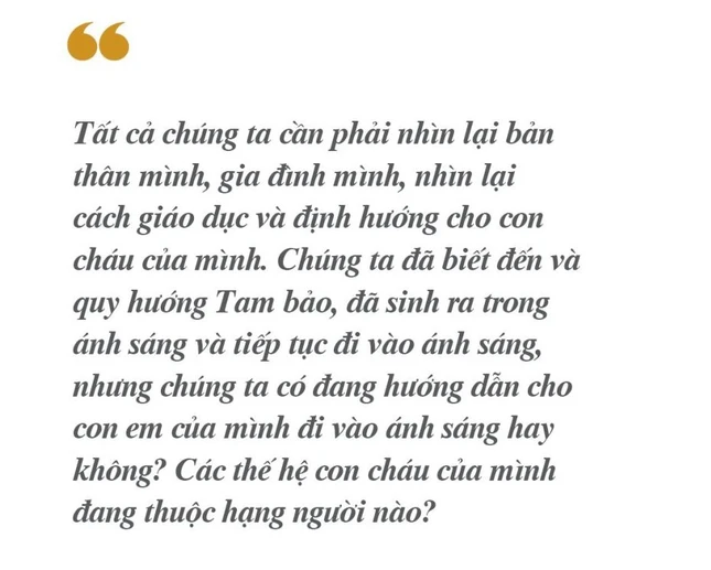 Đó là điều mà tất cả chúng ta cần phải nhìn lại bản thân mình, gia đình mình, nhìn lại cách giáo dục và định hướng cho con cháu của mình. Chúng ta đã biết đến và quy hướng Tam bảo, đã sinh ra trong ánh sáng và tiếp tục đi vào ánh sáng, nhưng chúng ta có đang hướng dẫn cho con em của mình đi vào ánh sáng hay không? Các thế hệ con cháu của mình đang thuộc hạng người nào?