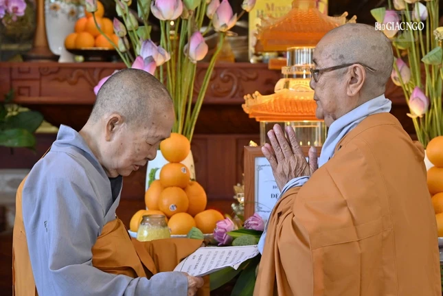 Sau đó, Thượng tọa Thích Thiện Thông đại lao tập thể Ban Trị sự GHPGVN TP.Vũng Tàu và chư hành giả an cư dâng lời tác bạch khánh tuế Trưởng lão Hòa thượng chứng minh và chư vị Hòa thượng phó thiền chủ trường hạ.