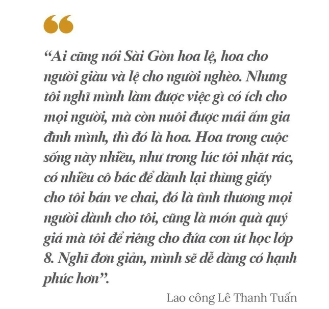 Trong phút nghỉ ngơi ngắn ngủi giữa lúc làm việc, sau khi chất rác lên đầy xe, vừa lấy dầu gió ra xức để bớt đi cái lạnh khi dầm mưa hơn 2 giờ đồng hồ, vừa để át đi mùi rác, chú Tuấn trải lòng: “37 năm làm nghề lao công nhặt rác, 12 tuổi đã vào nghề nên tôi rất trân quý cái nghề đã giúp mình nuôi cả gia đình. Nói gì nói, dù sợ Covid nhưng mình đâu thể nào ở nhà trong khi biết công việc của mình giúp ích cho cộng đồng”.