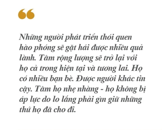 Những người phát triển thói quen hào phóng sẽ gặt hái được nhiều quả lành. Tâm rộng lượng sẽ trở lại với họ cả trong hiện tại và tương lai. Họ có nhiều bạn bè. Được người khác tin cậy. Tâm họ nhẹ nhàng - họ không bị áp lực do lo lắng phải gìn giữ những thứ họ đã cho đi. Và những kết quả tương tự sẽ tiếp tục đến trong tương lai, giống như khi chúng ta có một thúng lúa giống: nếu ta gieo chúng trên một cánh đồng, ta sẽ gặt hái được mười thúng gạo. Điều tương tự cũng đúng với tâm thiện lành mà ta phát triển được trong kiếp này. Tâm đó sẽ mang lại bao lợi lạc cho ta. Đó là cách nhìn của người trí.