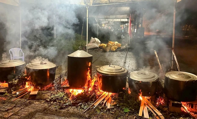 Hàng ngàn chiếc bánh tét được khẩn trương gói, nấu để kịp chuẩn bị chuyển ra chia sẻ bà con vùng lũ các tỉnh thành miền Bắc |