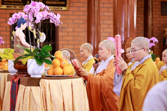 Tại buổi lễ, chư tôn đức Ni đã thức niêm hương bạch Phật, sái tịnh đàn tràng, thắp đèn diên thọ và khai kinh Dược Sư cầu nguyện quốc thái dân an.