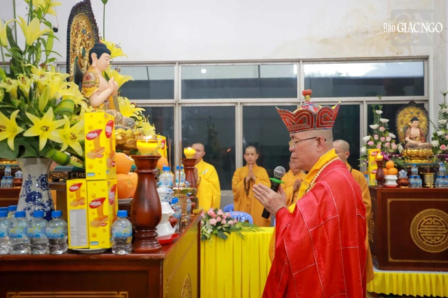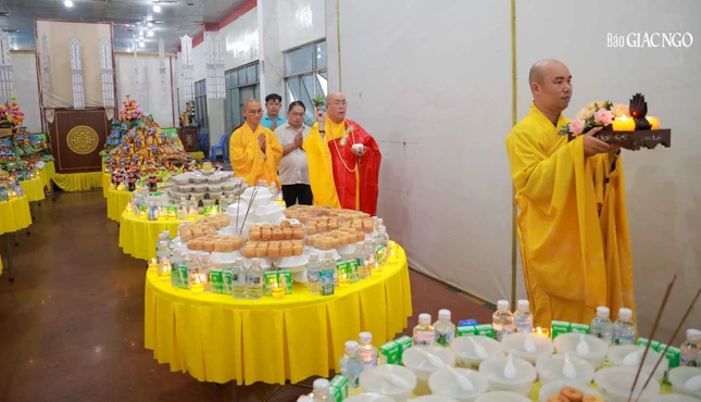 Sau nghi thức niêm hương bạch Phật, Thượng tọa Thích Đạt Đức, sám chủ khóa lễ đã sái tịnh đàn tràng. Trong không khí trang nghiêm, chư tôn đức Ban Kinh sư cử hành nghi thức lược khoa thí thực, phổ thí âm linh cô hồn và cầu nguyện chư hương linh vãng sanh cực lạc.
