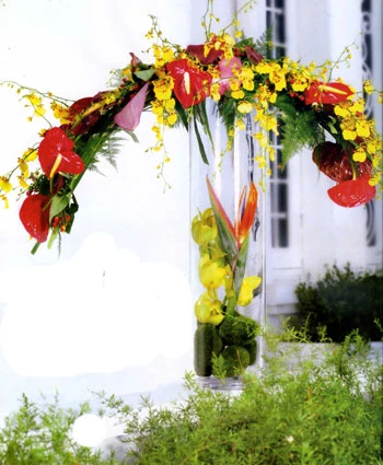 Vật liệu: Hoa loa kèn tây màu vàng cam, hoa môn màu đỏ và xanh, hoa cẩm chướng và hoa hồng màu đỏ, địa lan màu trắng, lan hồ điệp màu trắng và tím nhạt, hoa chuỗi ngọc.