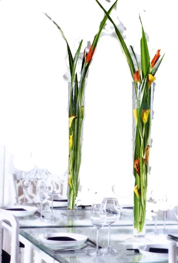 Vật liệu: Hoa loa kèn tây màu vàng cam, thiên điểu. Lá huệ lớn, bình thủy tinh.