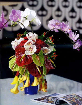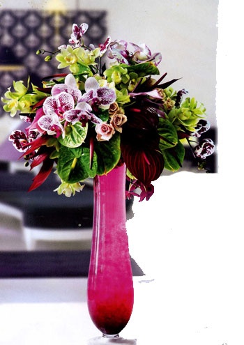Vật liệu: Hoa môn xanh, đỏ tía và tím; hoa hồng màu hồng nhạt, lan hồ điệp, địa lan màu xanh. Bình thủy tinh cao với đá gel hồng.