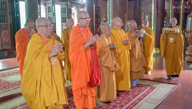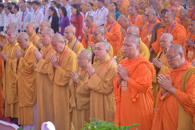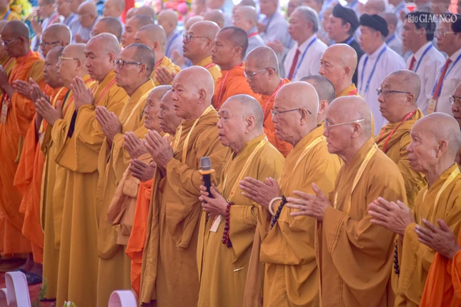 | Chư tôn đức, đại biểu thực hiện nghi thức tâm linh trước khi diễn ra đại hội |