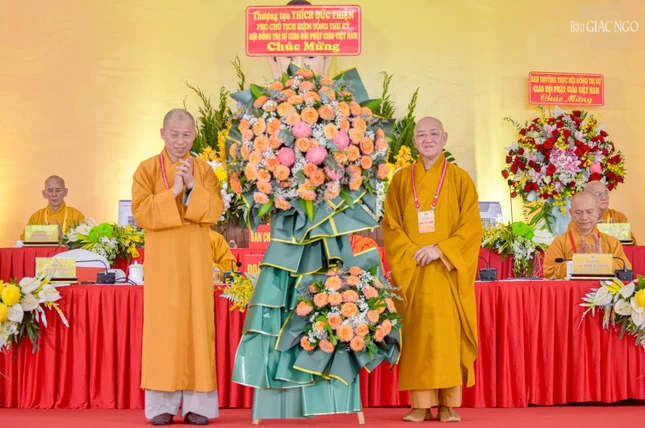 Thay mặt Trung ương Giáo hội, Trưởng lão Hòa thượng Thích Thiện Pháp tặng khánh vàng và hoa chúc mừng tân Trưởng ban Trị sự và thành viên Ban Trị sự Phật giáo TP.Cần Thơ nhiệm kỳ 2026-2031.