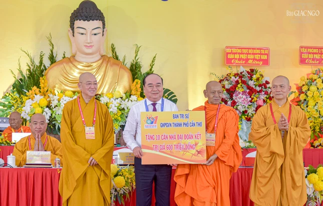 Dịp này, Ban Trị sự Phật giáo TP.Cần Thơ nhiệm kỳ 2026-2031 trao tặng 10 căn nhà Đại đoàn kết trị giá 600 triệu đồng, đồng hành cùng Ủy ban MTTQVN TP.Cần Thơ chăm lo cho an sinh xã hội.