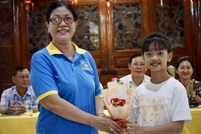 Đại diện học sinh nhận học bổng phát biểu tri ân đến Hòa thượng và thành viên câu lạc bộ dành tặng phần thưởng chuẩn bị cho ngày khai giảng năm học mới |