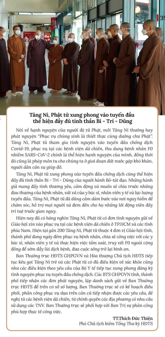 Thượng tọa Thích Đức Thiện, Phó Chủ tịch kiêm Tổng Thư ký Hội đồng Trị sự GHPGVN cho biết, tinh thần dấn thân phụng sự vì cộng đồng, xã hội, chung sức đẩy lùi dịch bệnh đã lan tỏa những giá trị thiết thực trong thời điểm đất nước gặp nguy nan, dịch bệnh. Đã có hàng ngàn lá thư tình nguyện của Tăng Ni, Phật tử trẻ gửi về Giáo hội, phát nguyện xung phong vào tuyến đầu chống dịch, đặc biệt thể hiện nguyện vọng xin đến các tỉnh phía Nam. Tinh thần “hộ quốc”, đồng hành cùng dân tộc đã trỗi lên mạnh mẽ trong thời điểm hiện nay khiến chúng ta tin tưởng dịch bệnh sẽ sớm được đẩy lùi.