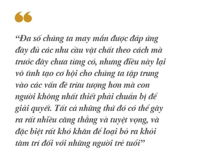 “Đa số chúng ta may mắn được đáp ứng đầy đủ các nhu cầu vật chất theo cách mà trước đây chưa từng có, nhưng điều này lại vô tình tạo cơ hội cho chúng ta tập trung vào các vấn đề trừu tượng hơn mà con người không nhất thiết phải chuẩn bị để giải quyết. Tất cả những thứ đó có thể gây ra rất nhiều căng thẳng và tuyệt vọng, và đặc biệt rất khó khăn để loại bỏ ra khỏi tâm trí đối với những người trẻ tuổi”, Corlette nói.
