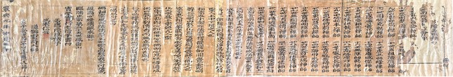 Hình thức: Văn bản có kích thước 31cm x 191cm, hiện trạng giấy đã bị phong hóa ố vàng, chữ viết theo lối Lệ thư trên nền hoa văn rồng uốn lượn đẹp mắt, có ép lụa bảo vệ. Tuy nhiên vì yếu tố thời gian, nội dung văn bản và họa tiết nền đã bị hư hoại nặng, nhiều nội dung mất đi khi lớp mặt giấy bị bong tróc. Trên văn bản này có ba dấu triện son với kích thước 3cm x 3cm ấn tại dòng Thiệt Vinh Bửu Hạnh lão Tăng thủ thư phó, tại dòng Vi biểu tín vân và cuối dòng niên hiệu Cảnh Hưng cửu niên trọng hạ, nhưng dấu đã bị mất 3/4 ấn.