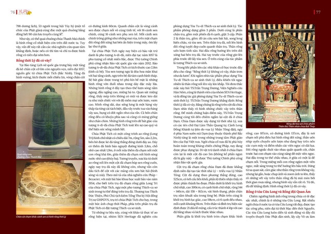 Trong khi phần lớn các nhà khảo cổ học trước đây đều cho rằng: “Rồng thời Lý không có vảy, thân trơn như da lươn”. Khi ngắm nhìn tác phẩm phục dựng Tòa Tu-di Thích-ca sơ sinh thời Lý, điều khiến tôi ngạc nhiên là thân rồng nổi lên vảy kín khắp. Tôi đem thắc mắc này hỏi TS.Trần Trọng Dương, Viện Nghiên cứu Hán Nôm, cũng là thành viên của nhóm SEN Heritage, và là đồng tác giả phỏng dựng Tòa Tu-di Thích-ca sơ sinh thời Lý. TS.Trần Trọng Dương khẳng định: Rồng thời Lý đã có vảy. Bằng chứng là rồng trên cột đá chùa Dạm nhìn thấy rõ hình những chiếc vảy trên thân rồng. Để minh chứng luận điểm này, TS.Trần Trọng Dương cùng tôi đến chiêm ngắm lại cột đá ở chùa Dạm. Chùa Dạm được xây dựng từ thời nhà Lý, xưa có các tên chữ Đại Lãm Thần Quang tự, Cảnh Long Đồng Khánh tự (tên do vua Lý Nhân Tông đặt), ngự ở phía Nam sườn núi Dạm (nay thuộc thành phố Bắc Ninh) từng là một trong những trung tâm Phật giáo lớn của Đại Việt xưa. Ngôi chùa cổ xưa đã bị phá hủy hoàn toàn trong kháng chiến chống Pháp, nay đang được phục dựng lại. Di vật trứ danh nhất ở chùa Dạm còn lại là một cột đá cao 5m (không kể phần ngọn đã bị gãy nát) - đã được Thủ tướng Chính phủ công nhận Bảo vật quốc gia.