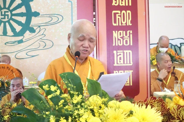 Thượng tọa Thích Huệ Khai, Phó Trưởng ban Thường trực Phật giáo tỉnh, cung tuyên hành trạng của cố Hòa thượng Thích Thiện Hoa, tôn hiệu được cung thỉnh định danh cho giới đàn.