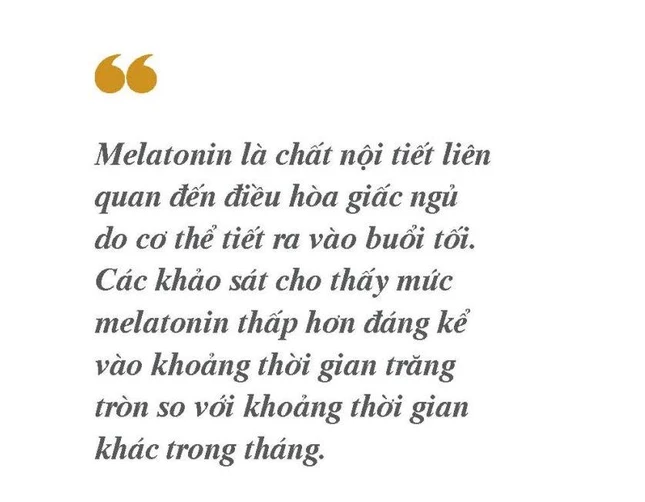 Melatonin là chất nội tiết liên quan đến điều hòa giấc ngủ do cơ thể tiết ra vào buổi tối. Các khảo sát cho thấy mức melatonin thấp hơn đáng kể vào khoảng thời gian trăng tròn so với khoảng thời gian khác trong tháng. Một bài báo gần đây đã báo cáo rằng chu kỳ giấc ngủ ở con người dao động trong chu kỳ 29,5 ngày âm lịch. Theo đó, con người đi ngủ muộn hơn và giấc ngủ ngắn hơn vào những đêm trước khi trăng tròn, hoặc khi có ánh trăng vào những giờ sau hoàng hôn.