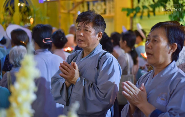 Sau đó, mọi người cùng nhau thiền hành, nhiễu tháp và thắp nến tưởng niệm dưới tôn tượng Bồ-tát.