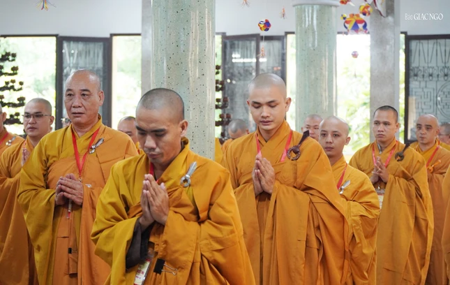 Sau sinh hoạt chung, chư Tăng đã vân tập chánh điện chùa Huỳnh Kim thực hiện nghi thức Bố-tát an cư theo truyền thống.
