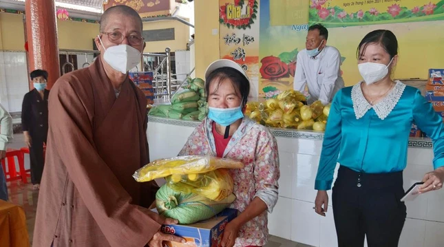 Đoàn do Thượng tọa Thích Lệ Tấn, Phó Trưởng ban Từ thiện - Xã hội GHPGVN tỉnh Long An, Trưởng ban Trị sự GHPGVN huyện Tân Thạnh trao tặng 50 phần quà cho học sinh nghèo hiếu học tại trường THCS, THPT Hậu Thạnh Đông và 50 phần quà đến người nghèo có hoàn cảnh khó khăn do ảnh hưởng của đại dịch Covid-19.