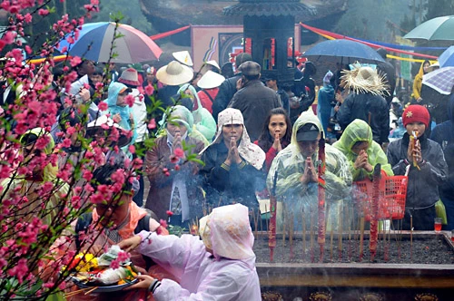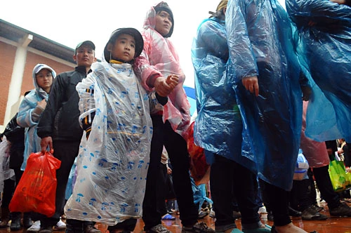 Người dân đội mưa xếp hàng vào mua vé lên động lễ chùa.