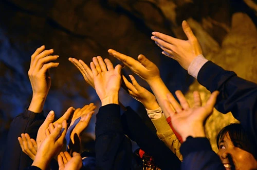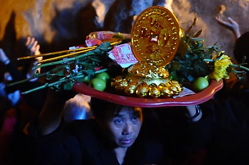 Trong động có những khối thạch nhũ liên tục nhỏ nước xuống nên ai cũng muốn hứng lấy giọt nước cầu may. Một cô gái dùng cả khay đựng đồ lễ trèo lên cao chờ hứng nước.