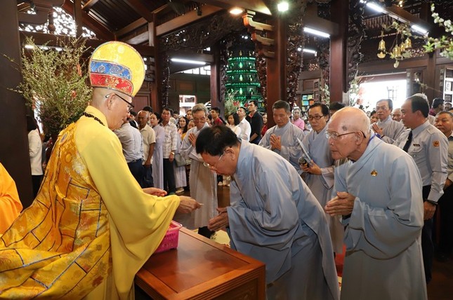 Sau khi niêm hương bạch Phật, Hòa thượng trụ trì và đại Tăng đã cử hành nghi thức kỳ an minh niên và kính mừng ngày đản sanh của Đức Di Lặc.