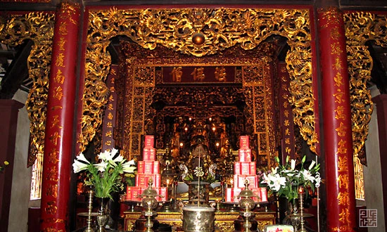 Tiền đường hướng về phía tây, hai bên nhà thiêu hương là hai dãy hành lang. Sau thượng điện là gác chuông. Gác chuông là một ngôi nhà ba gian, mái chồng diêm, nằm trên trục sảnh đường chính.