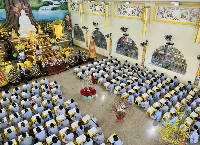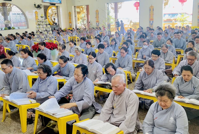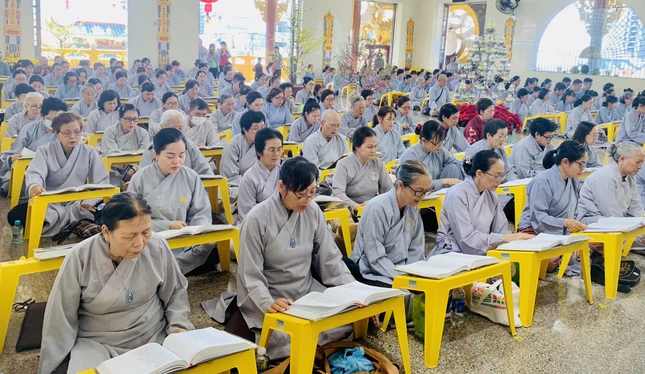 GNO - Chùa Vạn Đức (TP.Thủ Đức) đã trang nghiêm tổ chức khai pháp hội tụng kinh Pháp hoa nhân dịp đầu năm mới vào sáng mùng 2 Tết (11-2-2024).