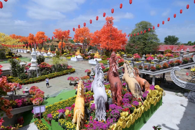 Điểm nhấn nổi bật trong tổng thể cảnh quang Tết năm nay là cụm linh vật mang tên “Ngũ phúc linh mã”, gồm năm chú ngựa được tạo hình sinh động, khỏe khoắn, tượng trưng cho năm phước lành: trường thọ, phú quý, khương ninh, đức hạnh, trí tuệ và năm điều đạo đức căn bản của người Phật tử.