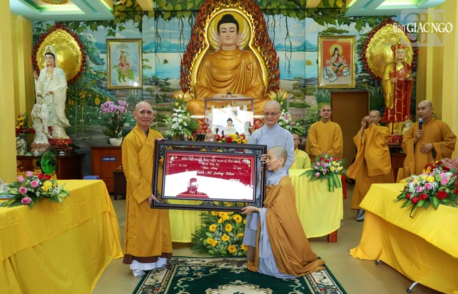 Thượng tọa Thích Đạt Đức đại diện Ban Trị sự Phật giáo TP.HCM trao quyết định bổ nhiệm trụ trì và con dấu đến Sư cô Thích nữ Quảng Khai.