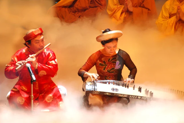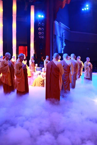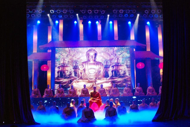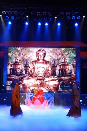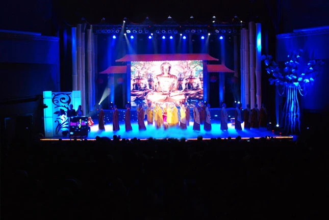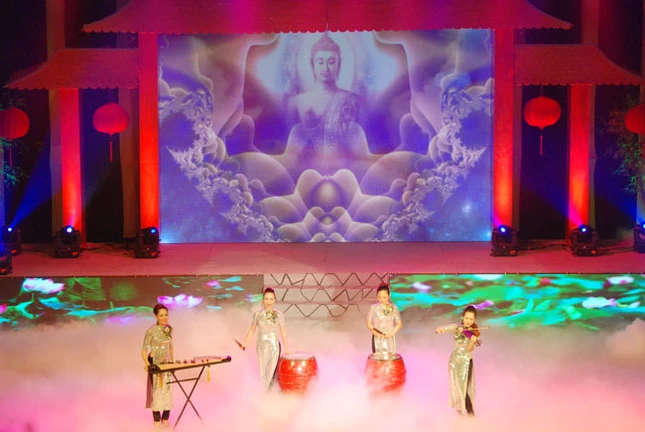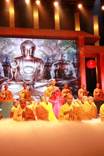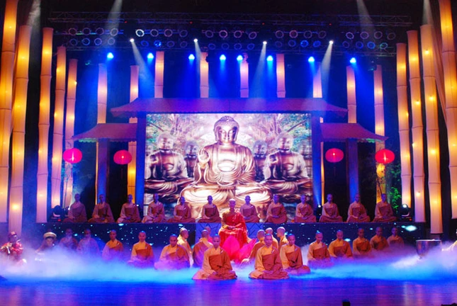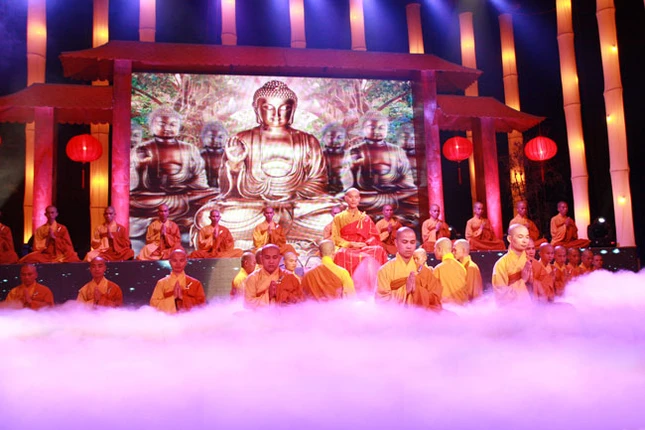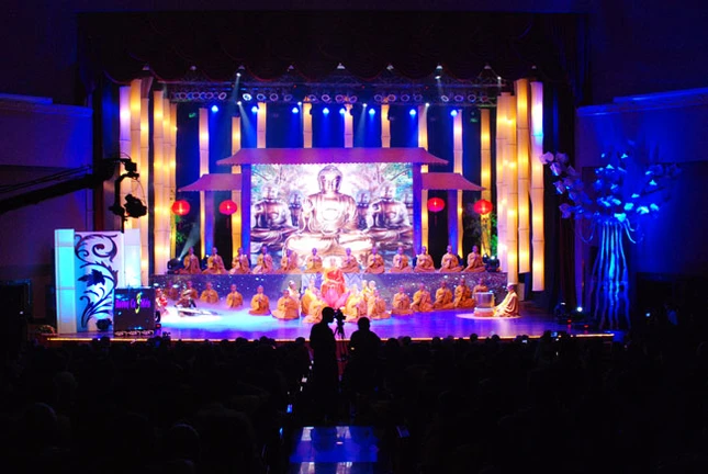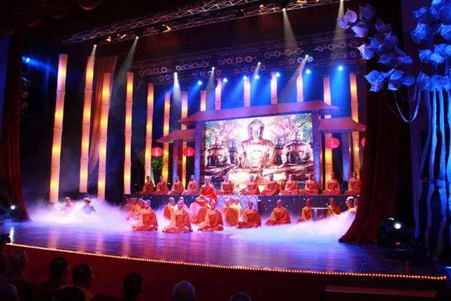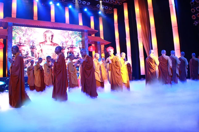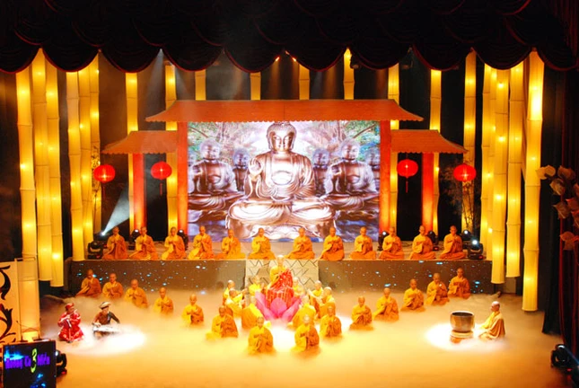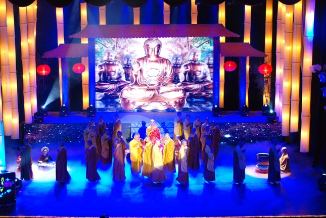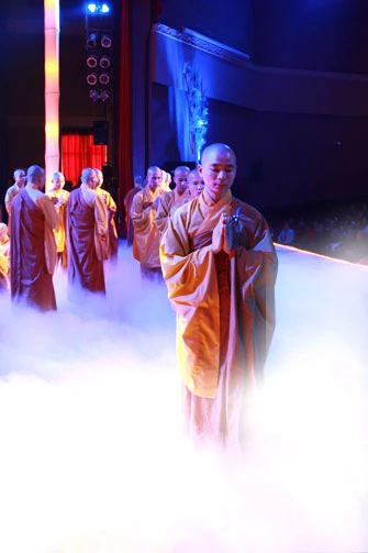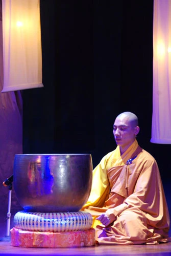 Mở đầu chương trình là tiết mục hô kệ thỉnh chuông của chư Tăng chùa Hoằng Pháp đã thật sự gây ấn tượng mạnh mẽ bằng âm hưởng ngân nga, trầm bổng của Đại đức Thích Tâm Hiếu hòa với tiếng đàn tranh và tiếng sáo của nghệ sĩ Vân Sơn, Hải Phượng đã làm rung động lòng người. Tiếp theo tiếng niệm danh hiệu Bổn sư Thích Ca Mâu Ni Phật của chư Tăng và toàn thể khán thính giả vang dội khắp nhà hát, đã làm lan tỏa trong không gian một nguồn năng lượng tâm linh. Rũ hết mọi lo toan, sân si, phiền não, mọi người đồng tâm hướng về Tam Bảo.