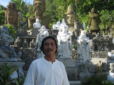 Điêu khắc gia Nguyễn Long Bửu bên cạnh vườn tác phẩm của mình.