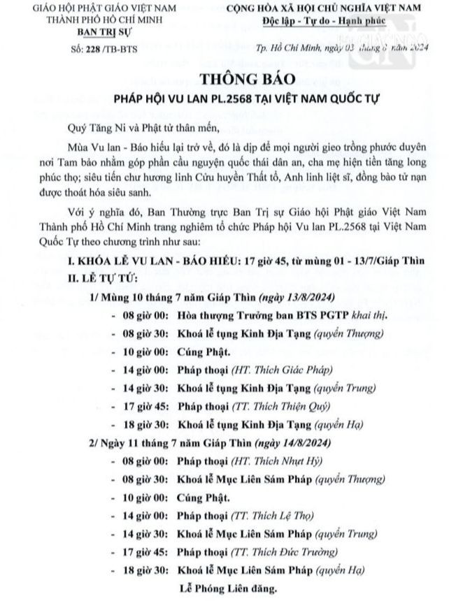 GNO - Hôm nay, 3-8, Hòa thượng Thích Lệ Trang, Trưởng ban Trị sự GHPGVN TP.HCM thay mặt Ban Thường trực Ban Trị sự GHPGVN TP.HCM, Ban Quản trị Việt Nam Quốc Tự phổ biến thông báo về việc tổ chức trang nghiêm Pháp hội Vu lan Phật lịch 2568, tại Việt Nam Quốc Tự (số 242-244, đường 3/2, P.12, Q.10, TP.HCM).