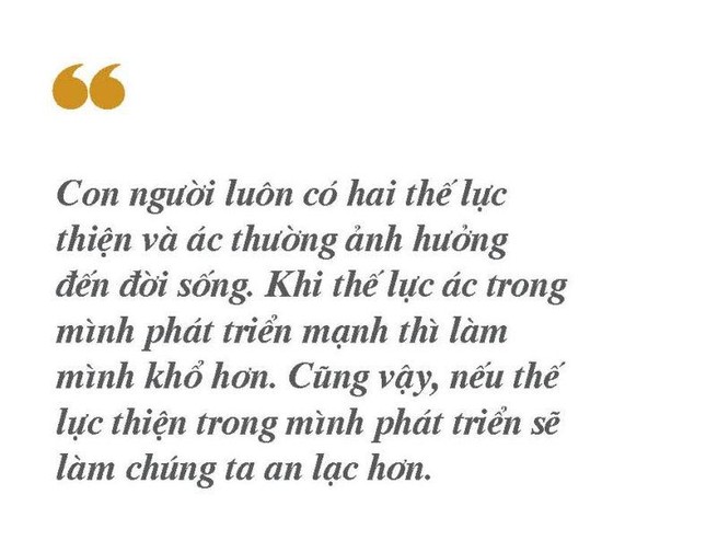 Tôi gặp một thiền sư ở Nhật nói lý này làm tôi ngộ được. Lúc Việt Nam chiến tranh có người Mỹ, người Hàn, người Úc tới Việt Nam tham chiến bị chết. Ngài nói đây là thế giới của quỷ thần, vì nghiệp còn nên họ tự dẫn thân tới Việt Nam để chết. Tôi cũng cầu nguyện cho họ giải oan nghiệp, đừng hận thù nữa. Vì nếu hận thù còn thì Việt Nam hết chiến tranh, họ sẽ qua Irak, Irak hết chiến tranh, sẽ qua Afghanistan và bây giờ đến Ukraina. Hễ chiến tranh chỗ này tàn thì thế lực ác lại gầy dựng chỗ khác. Và chính lòng hận thù sẽ chiêu cảm họ tới chỗ có chiến tranh. Vì vậy, giải được oan nghiệp này, chiến tranh khu vực, chiến tranh thế giới mới chấm dứt.