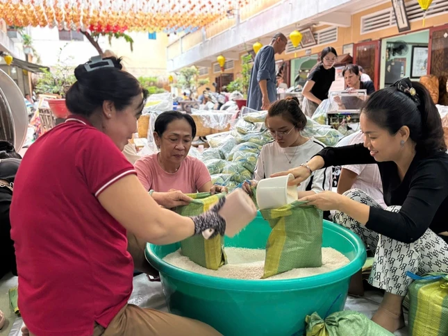 | Chung tay hỗ trợ sắp xếp và chia các phần quà tại chùa Bửa Đà |