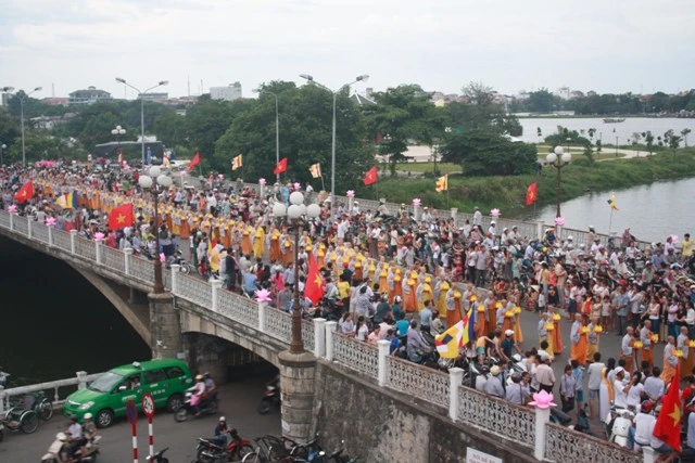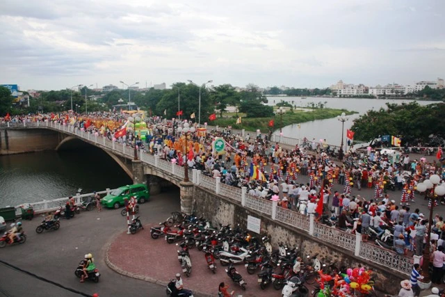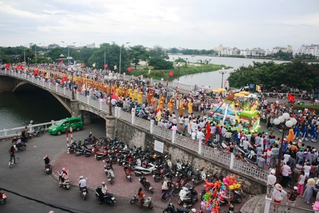 Đoàn rước Phật đi ngang qua cầu Trường Tiền và Đài Thánh Tử Đạo