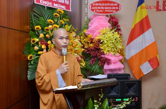 Thay mặt Ban Tổ chức, Thượng tọa Thích Lệ Quang, Phó ban Thông tin - Truyền thông phát biểu cảm tạ, khép lại lễ công bố quyết định và ra mắt thành phần nhân sự Ban Thông tin - Truyền thông GHPGVN TP.HCM.