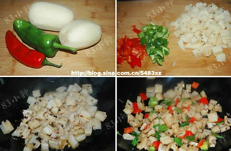Thái ớt xanh và ớt đỏ thành từng miếng nhỏ, gọt vỏ củ sen rồi thái thành từng miếng nhỏ.