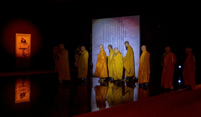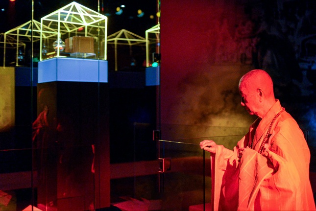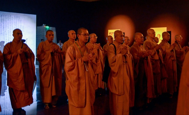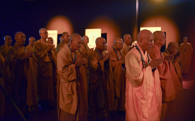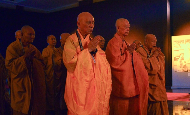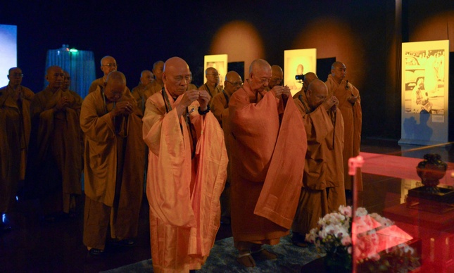 Đức Pháp chủ cùng chư vị Trưởng lão, giáo phẩm mật niệm pháp thân bất diệt của Bồ-tát Thích Quảng Đức trước khi cung thỉnh xá-lợi Trái tim của Ngài an vị nơi tháp Đa Bảo |