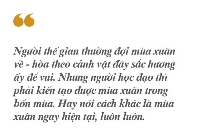 Người thế gian thường đợi mùa xuân về - hòa theo cảnh vật đầy sắc hương ấy để vui. Nhưng người học đạo thì phải kiến tạo được mùa xuân trong bốn mùa. Hay nói cách khác là mùa xuân ngay hiện tại, luôn luôn. Để làm được điều mầu nhiệm này đương nhiên từ bên trong tới bên ngoài, ta phải thấm sâu ý đạo, tỉnh thức, chánh niệm để không dính mắc lại trước được mất, hơn thua, thị phi và mỉm cười được trong tất cả mọi sự mọi việc đến với mình.