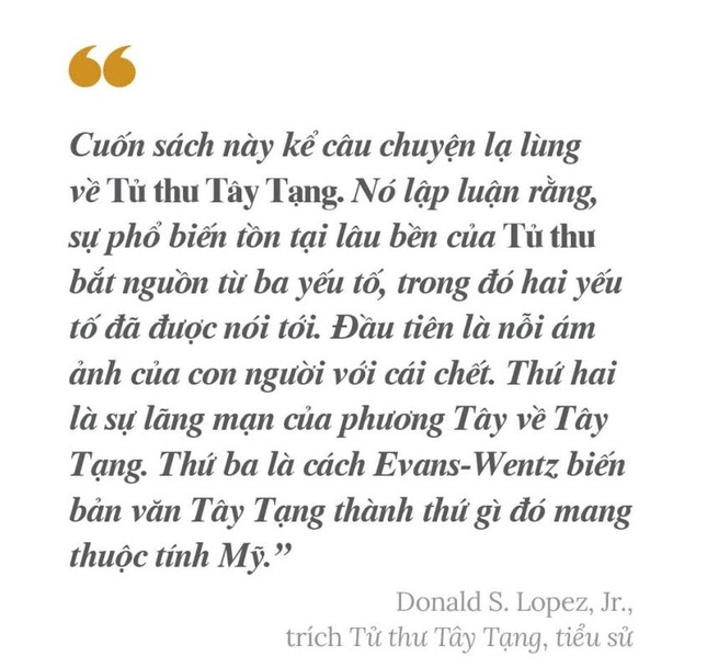 Trên hành trình khám phá đời sống của giáo điển này, Tử thư Tây Tạng, tiểu sử của Donald S.Lopez, Jr. lại là một cẩm nang cần thiết lẫn thú vị dành cho chúng ta. Sự thú vị của cuốn sách, như đã nói, đến từ biệt tài kể chuyện và dẫn dắt người đọc của tác giả. Và như nhận xét của Keneth I. Woodward, biên tập viên cộng tác của Newsweek, có lẽ chẳng ai khác ngoài Lopez có thể nghĩ đến việc bắt đầu một cuốn sách nghiên cứu về một giáo điển Phật học “bằng câu chuyện về nhà tiên tri Mormon Joseph Smith”!